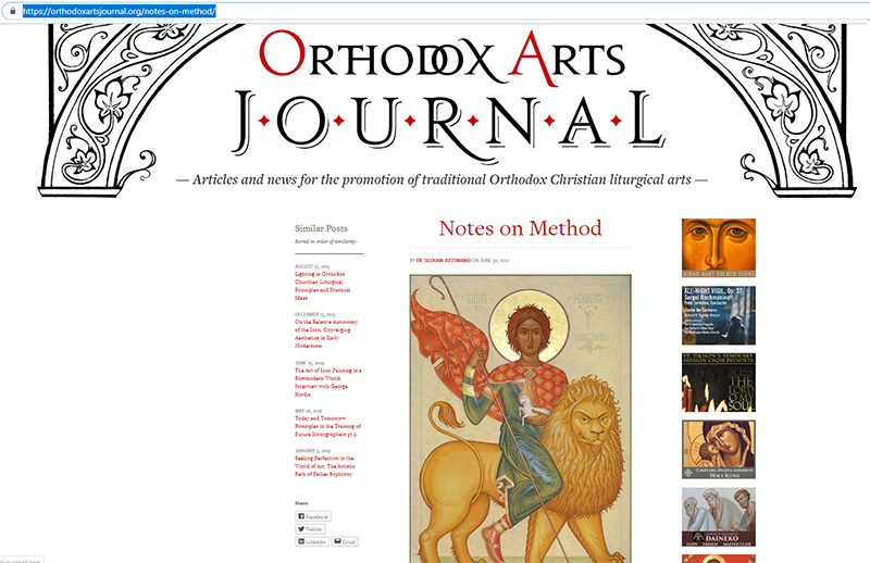 - Notes on Method, in the Orthodox Art Journal, very interesting article by iconographer Father Silouan Justiniano of the Brotherhood of the Holy Cross (ROCOR) in Long Island, New York.