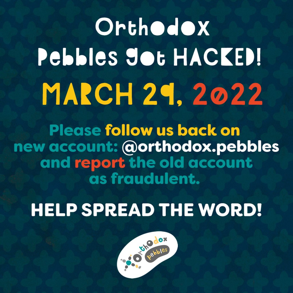We are sharing some unfortunate news: The Orthodox Pebbles Instagram account got hacked yesterday. The account was taken over and we can’t have any access to it. It is posting malicious content and sending messages on our behalf, trying to manipulate Orthodox Pebbles followers. There is absolutely nothing we can do about it! We can’t contact the followers to warn them or get back into our account.
