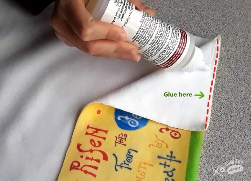 Spread glue on the edges of the inside of the pocket except the top. Fabric glue or tacky glue works.