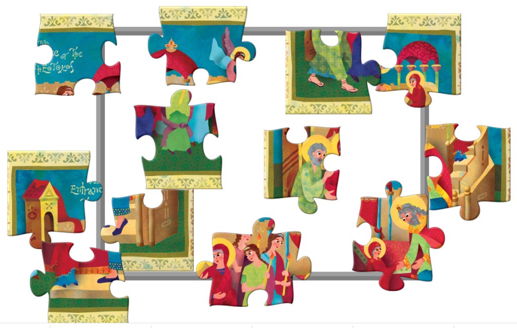 Move the pieces around to make a scene inspired by the icon of the Entrance.