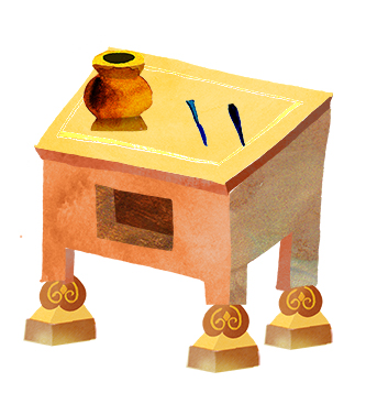 The Evangelist Matthew is depicted as an old man with thick white hair and a long, pointy beard. His facial expression is serious and he is concentrated in his writing. He is often seated in an armchair with his body leaning towards a small table on which his writing instruments are placed. The book he is writing reads the first verse of his Gospel account in Greek: โBible of the genealogy of Jesus Christโฆโ. Next to or on the table there may be a a scroll with Hebrew characters – this is to signify that Matthew first wrote his Gospel account in Hebrew and later translated it into Greek.