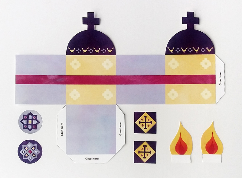 In Greece where we originate from, it is customary for young children to carry a lantern instead of a candle during the Epitaphios procession on Holy Friday evening, and this is where the inspiration for this craft comes from. The end result is a small lantern that the child can actually hold during the service. The color combination is based on purple, which is the color associated with mourning in the Orthodox tradition. The best effect is achieved when using an LED votive candle, so that the child can actually light up the lantern, while safely holding it and moving around. In the absence of an LED votive, we have provided a flame template that you can use instead, to pretend there is a fire lighting inside the lantern.