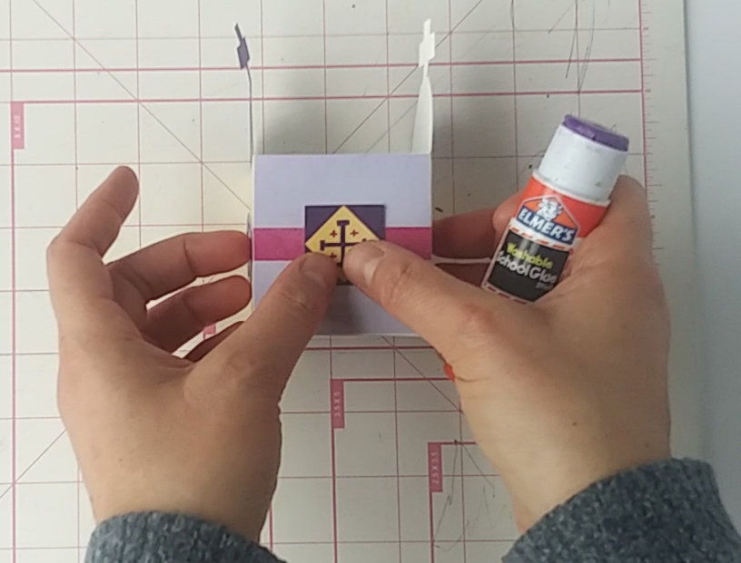 If you want to use the flame template, glue the two flame templates together back-to-back, leaving the white rectangle on the bottom unglued. Fold the white rectangles up, each one to the opposite side of the other. Glue the flame on the inside of the base of the lantern. If you have an LED votive candle, it can be used instead of the flame template.