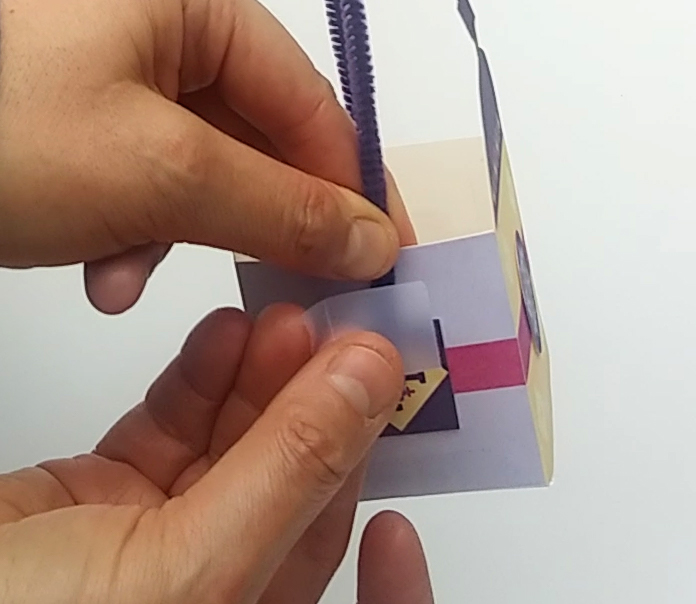 Glue or tape any desired decorations onto the lantern, then staple or tape the pipe cleaner handle. For sturdiness, fold up the end of the pipe cleaner that is protruding below the tape or staple. Tie the two ribbons into bows around the pipe cleaner handle.