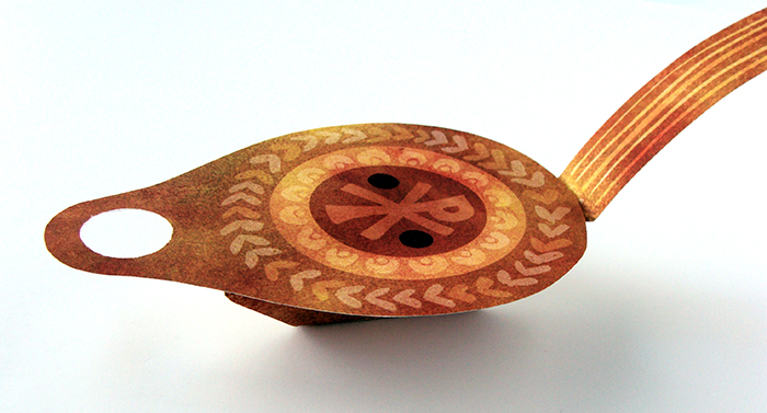 Tie the flame-shaped pieces together using the string. Thread the string through the hole in the lamp, pull down to position the flames correctly, and tape in place. Then cut off the part of the string that is not needed. You might want to place the remainder of the string in the hollow part of the lamp’s bottom part, and tape it so it stays put; thus demonstrating how oil lamps actually worked.