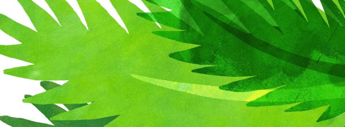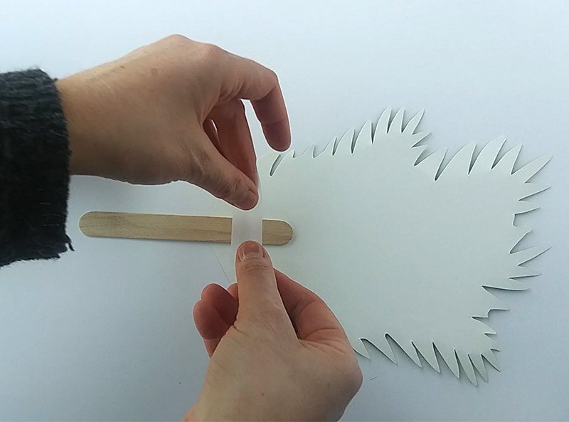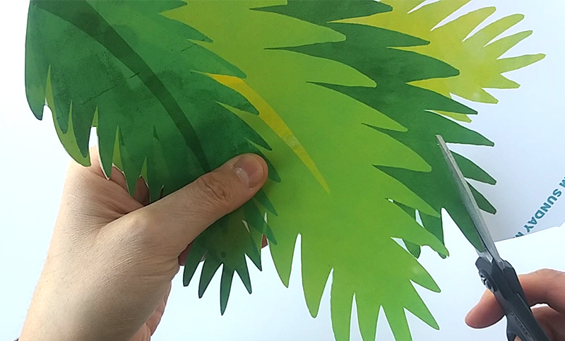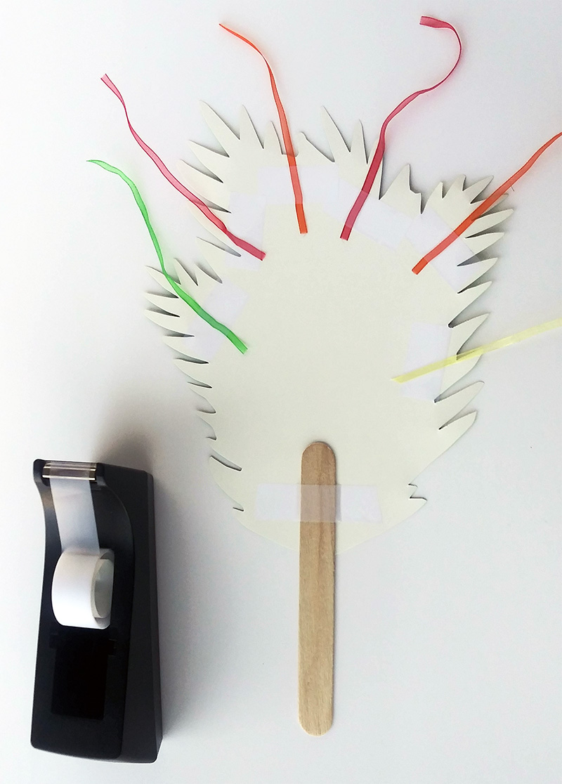 Cut out the palm leaf template. You can be as detailed as you like, either cutting around every little shape like we did in the photos, or cutting around the overall shape of the waver. Tape the blank side of the leaf template onto the craft stick . Tape the ribbon pieces onto the top part of the back side of the leaf or tie them around the stick.