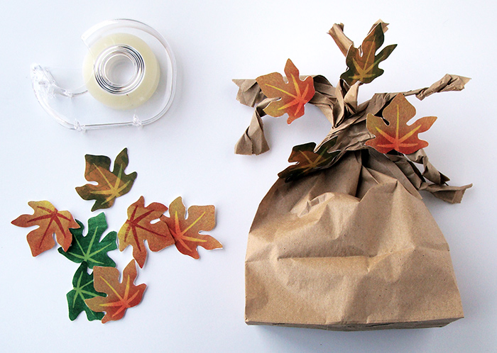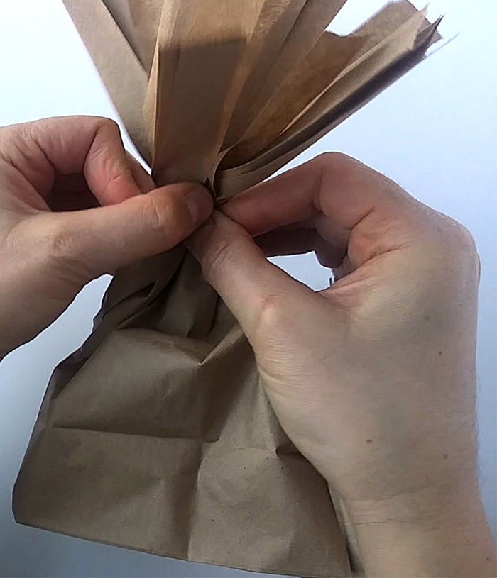 Cut the paper bag into 1/2-inch strips, starting from the top and going half-way down. Open the bag, stand it up, then twist it at the middle to create the trunk.