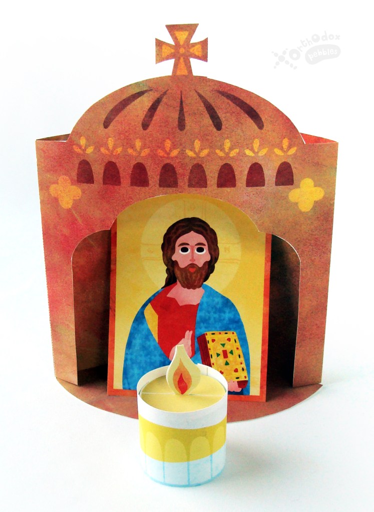 This craft is a replica of an icon corner stand, complete with an icon of Christ and a vigil lamp.