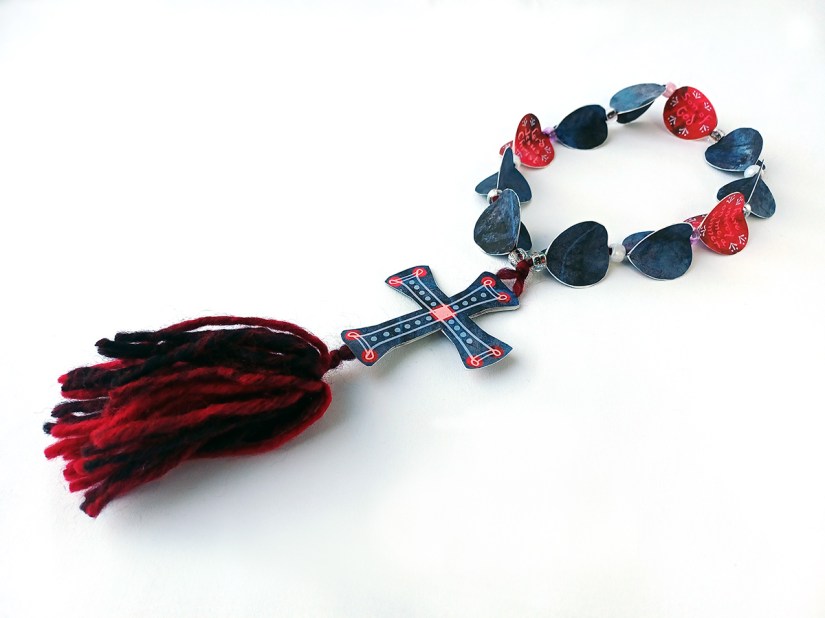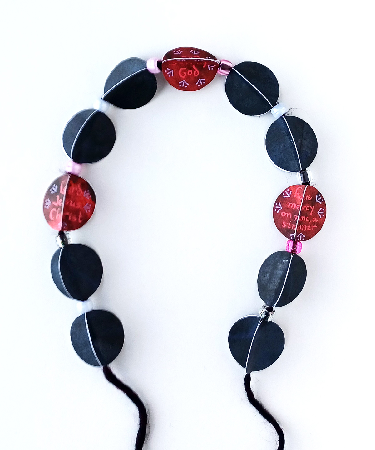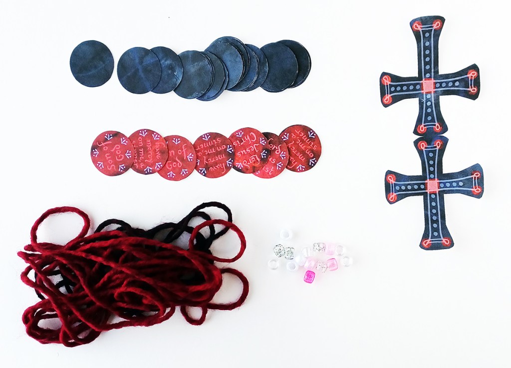 For very young children, skip the yarn altogether and glue the circles onto a piece of paper, forming a loop that looks like a prayer rope. Glue only one part of the cross underneath the loop. Make the tassel separately, and glue or tape it at the bottom of the prayer rope.