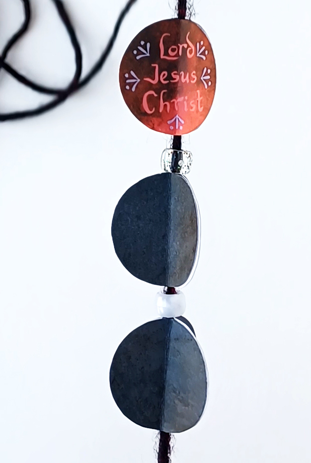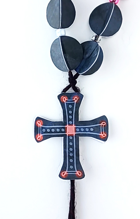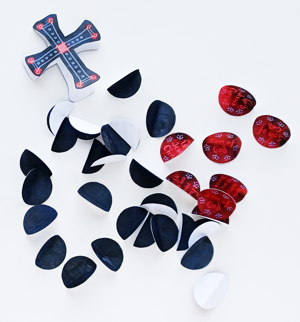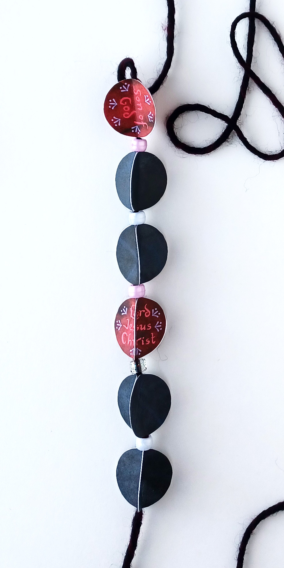 Instead of using three paper circles to make each “knot”, use two circles, sandwiching the yarn between them without first folding the circles. The resulting prayer rope will have less of a 3D feel, but it will still look pretty.