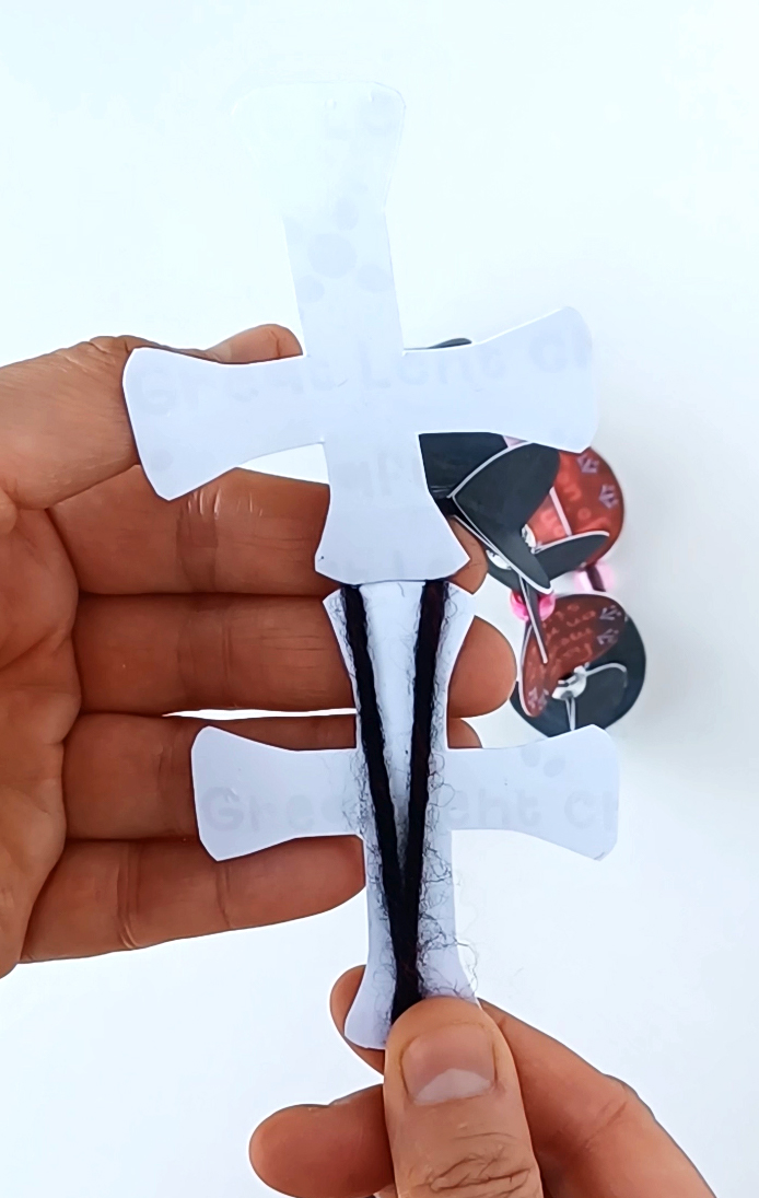 The craft is designed to look pretty just as it is. However, if you wish, you can further embellish it by gluing additional materials of your choice onto the “knots” and the cross.