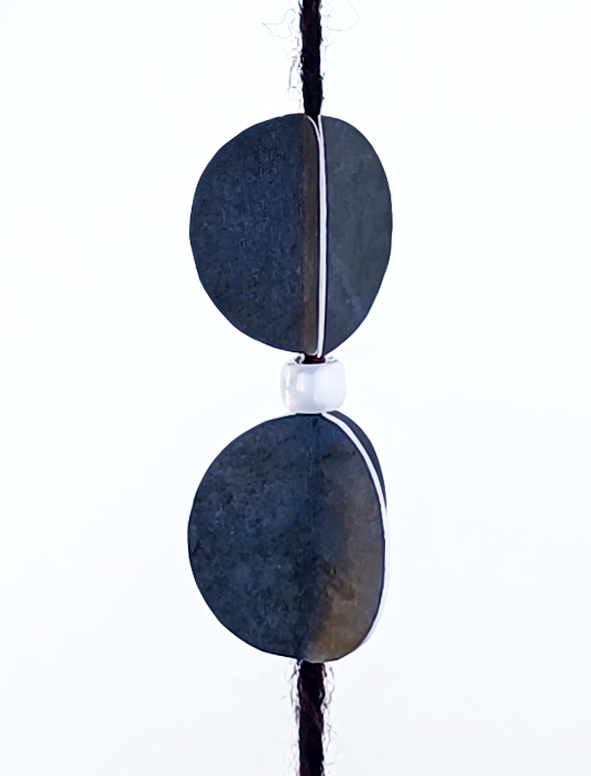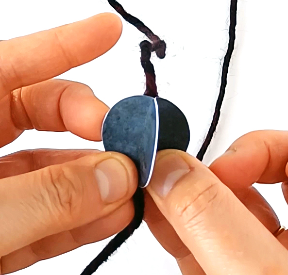 If using pony beads, thread one or more beads onto the yarn. Make the second black “knot” in the same way as the first one.