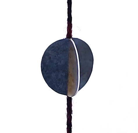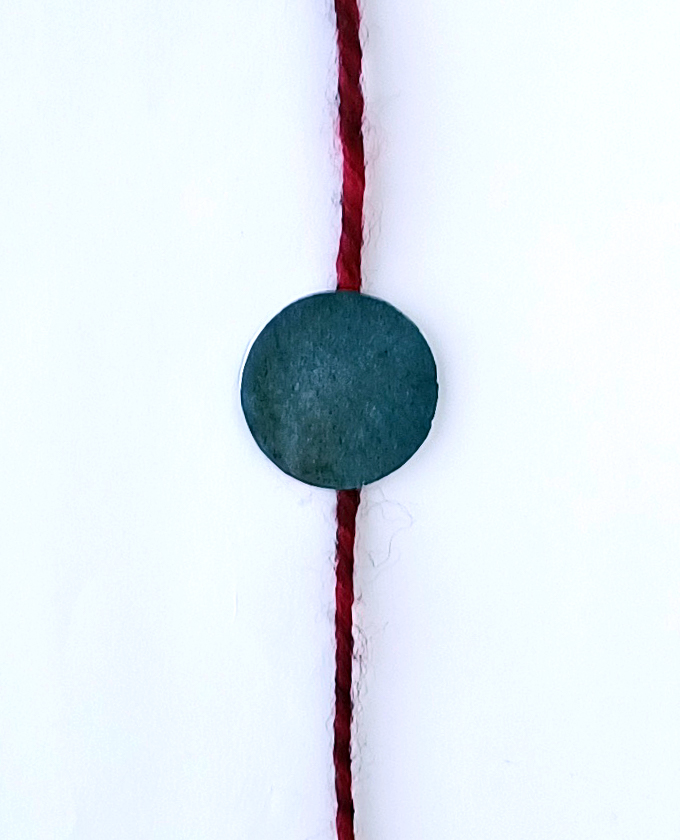 Make the first “knot” of the prayer rope – for each “knot”, you will need three circles. Glue two black circles together, only gluing them on one half side, and leaving the other half side unglued. Place a long piece of yarn between the two circles lengthwise, allowing some yarn to hang free on both sides. Glue a third circle onto the other two, sandwiching the yarn in the center.