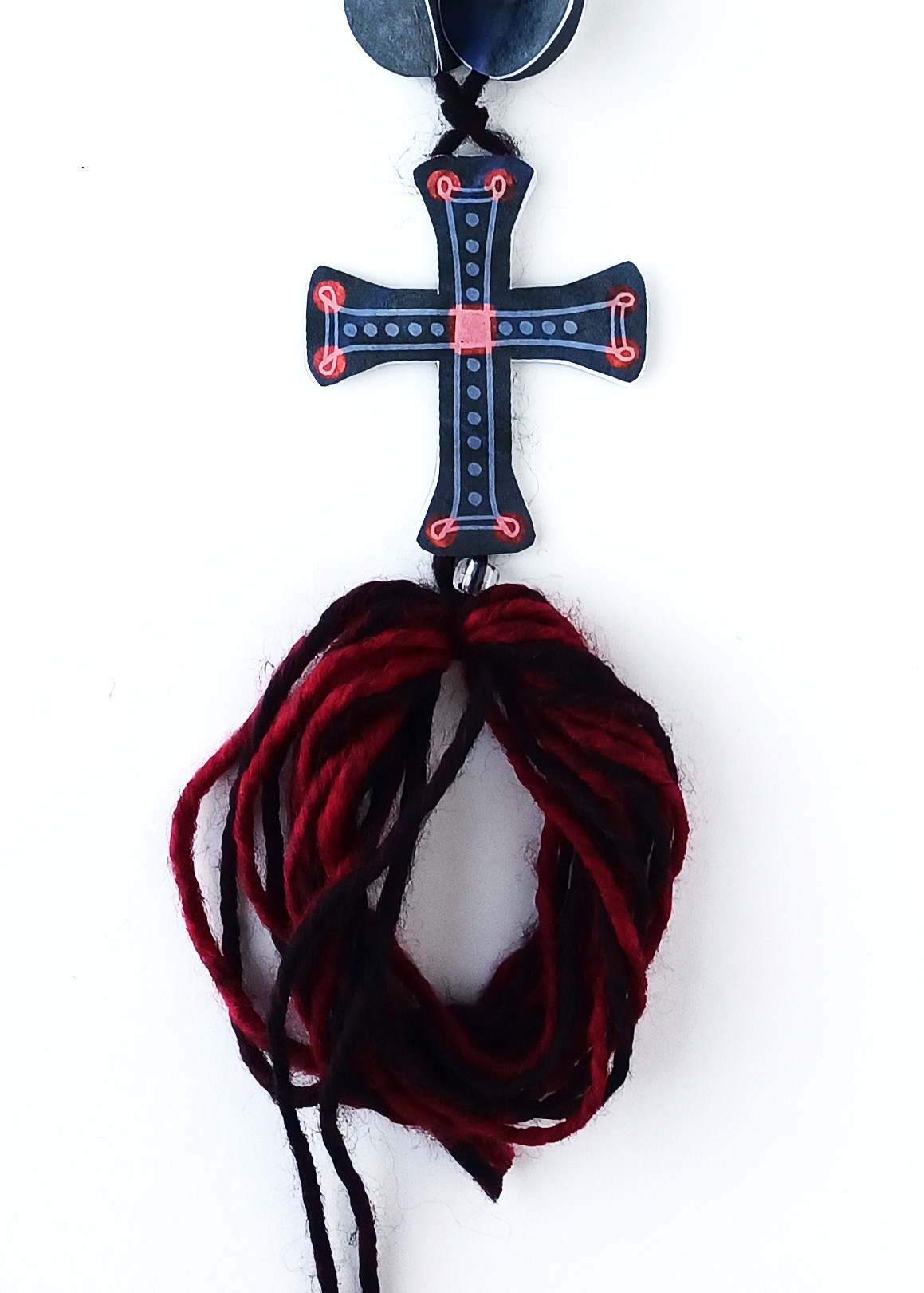 Tie the loose ends of the yarn into a knot to make a closed loop. At that point, you can thread one or more pony beads if you wish, and tie a knot again. Then attach the cross as follows: Unfold the cross, pass both threads of yarn through the unfolded cross from top to bottom, then fold the cross over the yarn and glue the two parts of the cross together, sandwiching the yarn between them. Tie another knot under the cross and thread one or more extra beads if you wish. Finish with one final knot.
