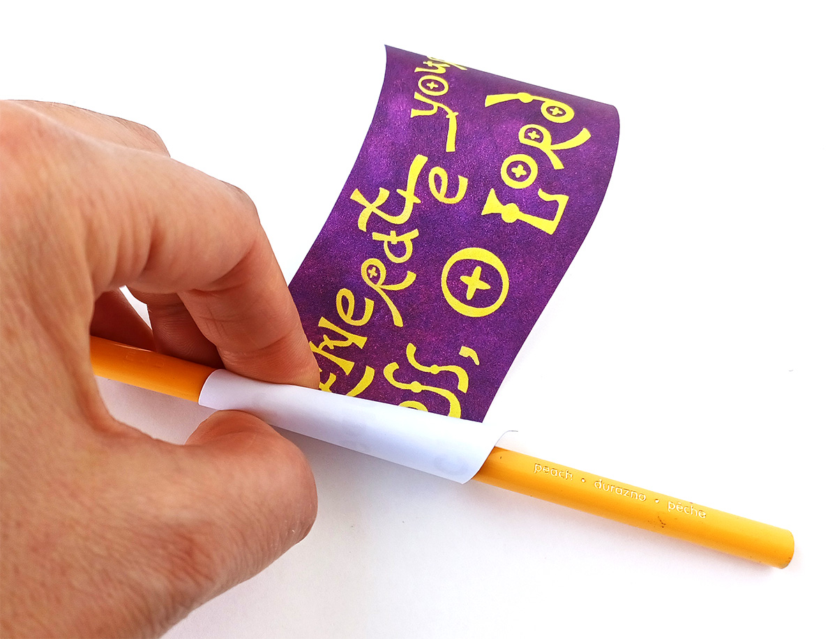 If you would like the scroll-type label to have a three-dimensional look, roll the edges around a pencil, one edge to one side and the other one to the opposite side.