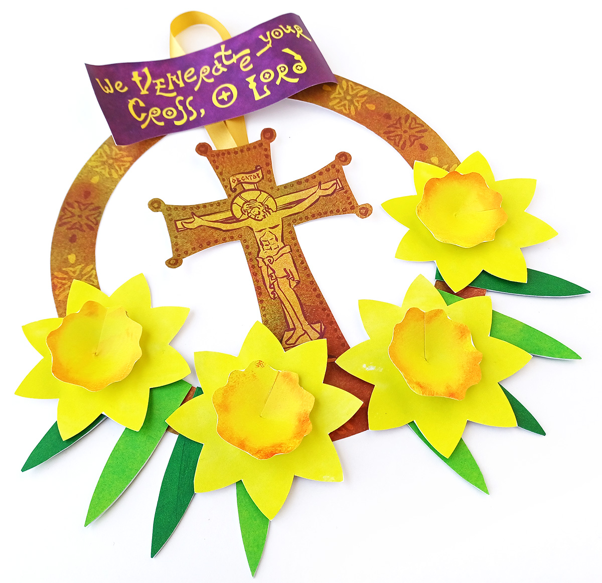 This craft is a paper wreath to honor the Holy Cross, inspired by the Church celebration of the Feast of the Veneration of the Holy Cross.