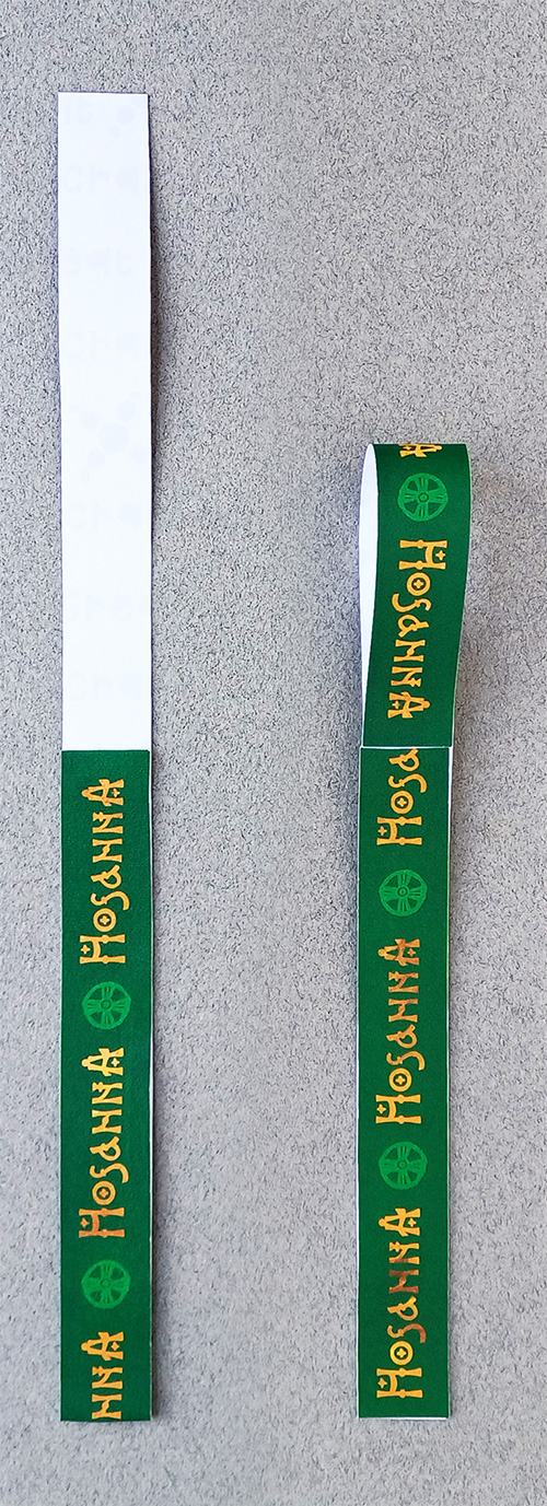 Glue one of the half “Hosanna” strips onto the back side of the bottom half of a long “Hosanna” strip. Fold the top part of the long strip over, forming a loop, and glue it exactly where the short strip ends.
