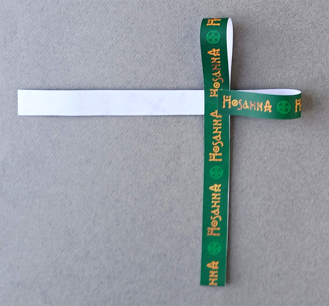 - Thread a piece of ribbon through the top of the cross and secure with a knot. Tie a second knot at the other end of the ribbon, to help it stay in place later.