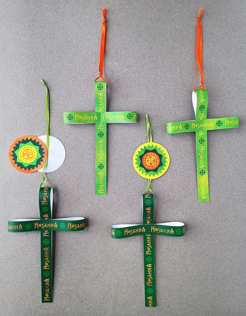 - For two of the crosses, tape the ribbon onto the back of one of the colorful circles. Cover with the other colorful circle, sandwiching the ribbon between the two circles and gluing to secure.
