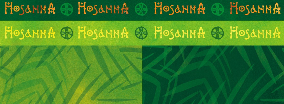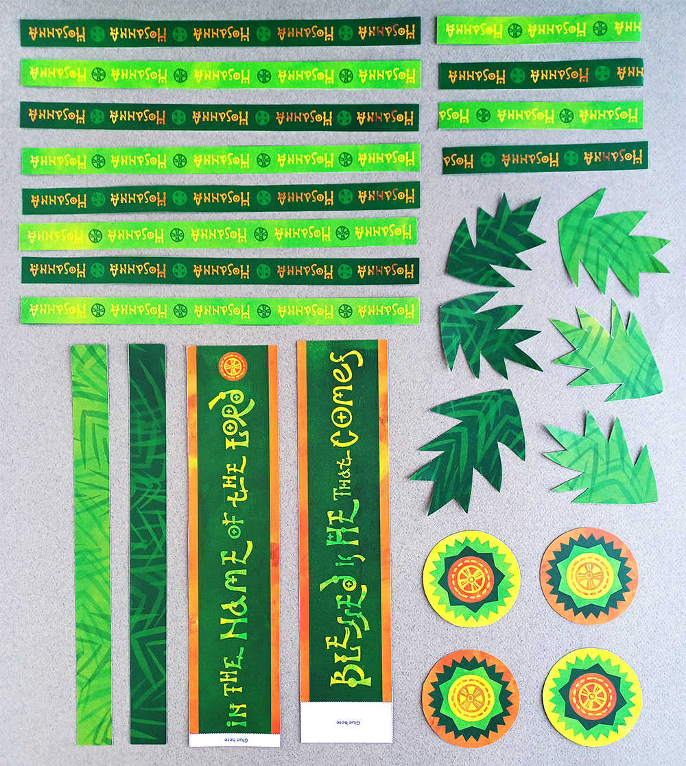 Cut out the template shapes as marked. There will be a remaining piece of the green leaf-patterned page; from that piece, cut out your own palm leaf-shaped designs, making them look any way you like. From the “Hosanna” strips, choose a light and a dark green one; cut them in half crosswise.