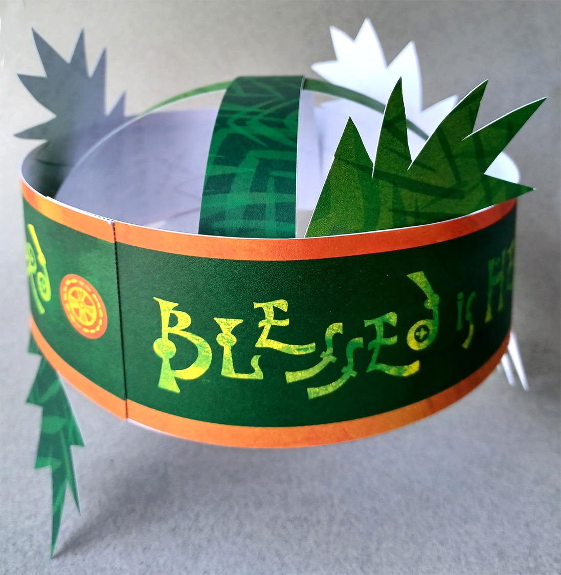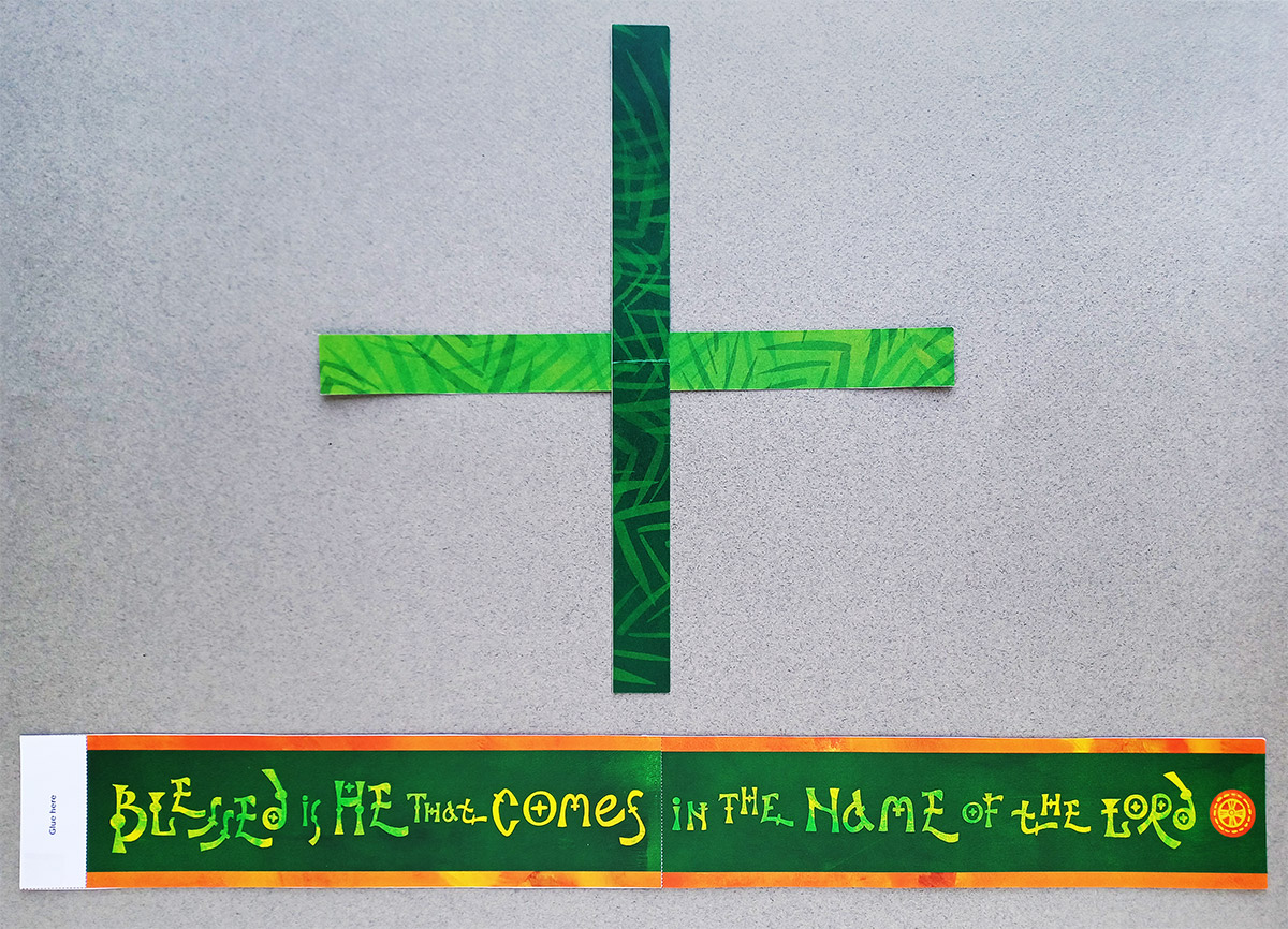 Glue the two ends of the long strip together as marked to make a cylinder. Tape the cross on the inside of the cylinder as shown. Glue or tape the palm leaf shapes all around the inside of the cylinder.