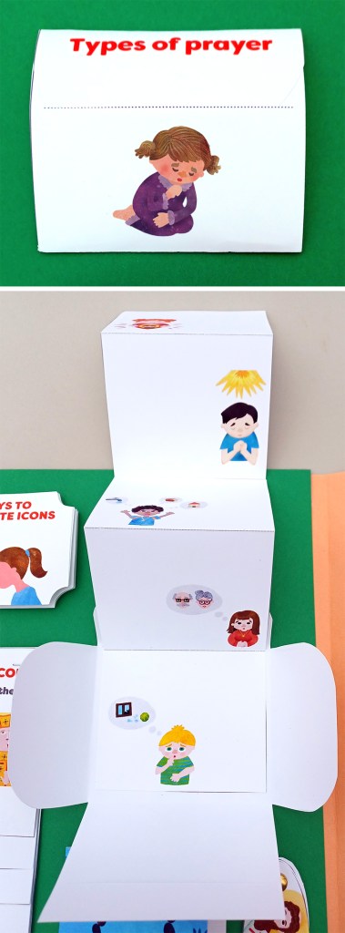 On each part of the accordion, the child writes (or draws a picture of) their own example of a type of prayer.