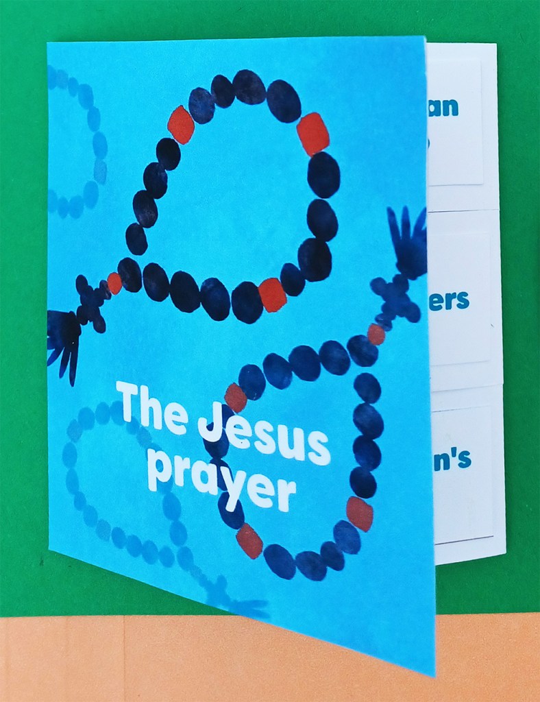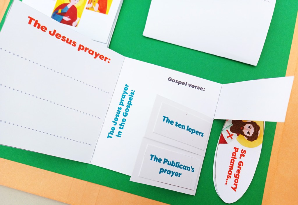 On the left-hand flap, the child writes the Jesus prayer. On each smaller flap, and while the flaps are folded, the child glues one of the story titles. Then the child lifts the small flaps and, underneath each flap, writes the Gospel verse where the prayer is mentioned in each story. Reading and discussing the whole story while searching for the specific verse is a good idea.