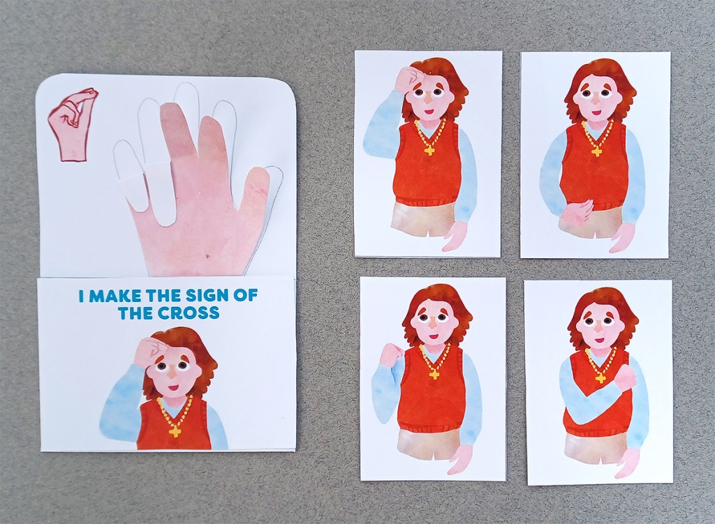 On the hand shape, the child folds the fingers to show their correct position when making the sign of the cross. Then the child takes the cards out of the pocket and sorts them in the correct order.