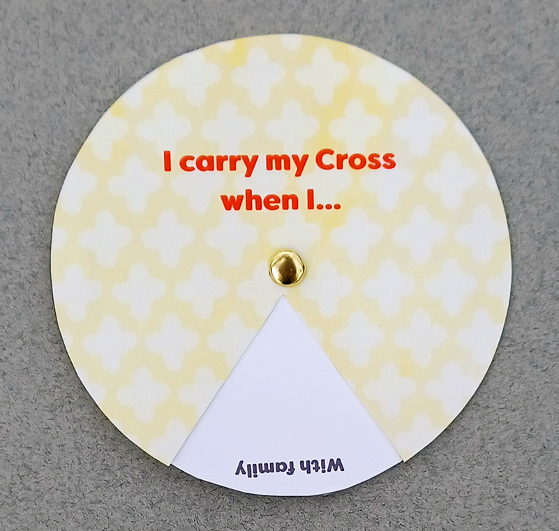 On the bottom part of the wheel, the child writes (or draws a picture of) different situations demonstrating the meaning of the phrase “carry my Cross”. Examples: help with household chores / let others go before me in line / help my siblings with homework / don’t complain when things don’t go my way etc.