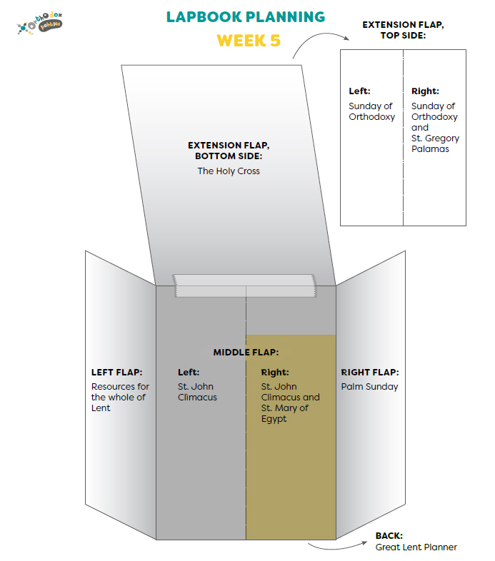 The lapbook is separated into sections, one section for each Sunday of Great Lent. The student can work on the lapbook gradually, aiming to have it completed by Palm Sunday evening.