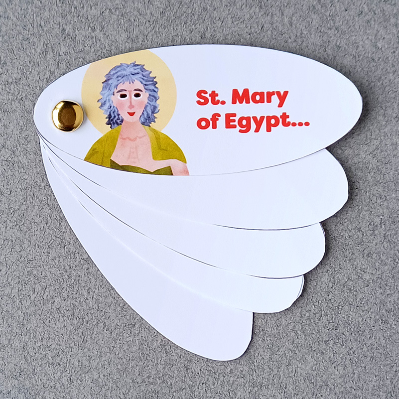 On each piece, the child writes (or draws a picture of) a characteristic of St. Mary of Egypt or a fact from her life. Examples: St. Mary of Egypt… lived in the 6th century / was a hermit / lived alone in the desert / is a model of repentanceโฆ etc.