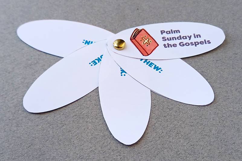 The Triumphant Entry of our Lord into Jerusalem is described in all four Gospel Books. On each piece, the child writes the relevant verses from each Gospel. It is best to read each story and compare the different accounts. This activity can be skipped for younger children.