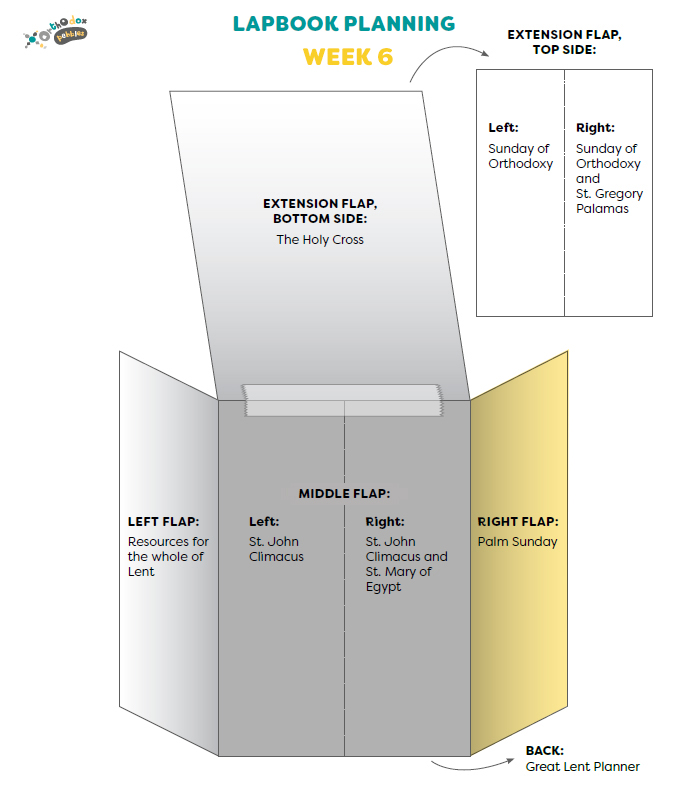 The lapbook is separated into sections, one section for each Sunday of Great Lent. The student can work on the lapbook gradually, aiming to have it finished by Palm Sunday evening. This is the sixth and final entry, completing the whole lapbook.