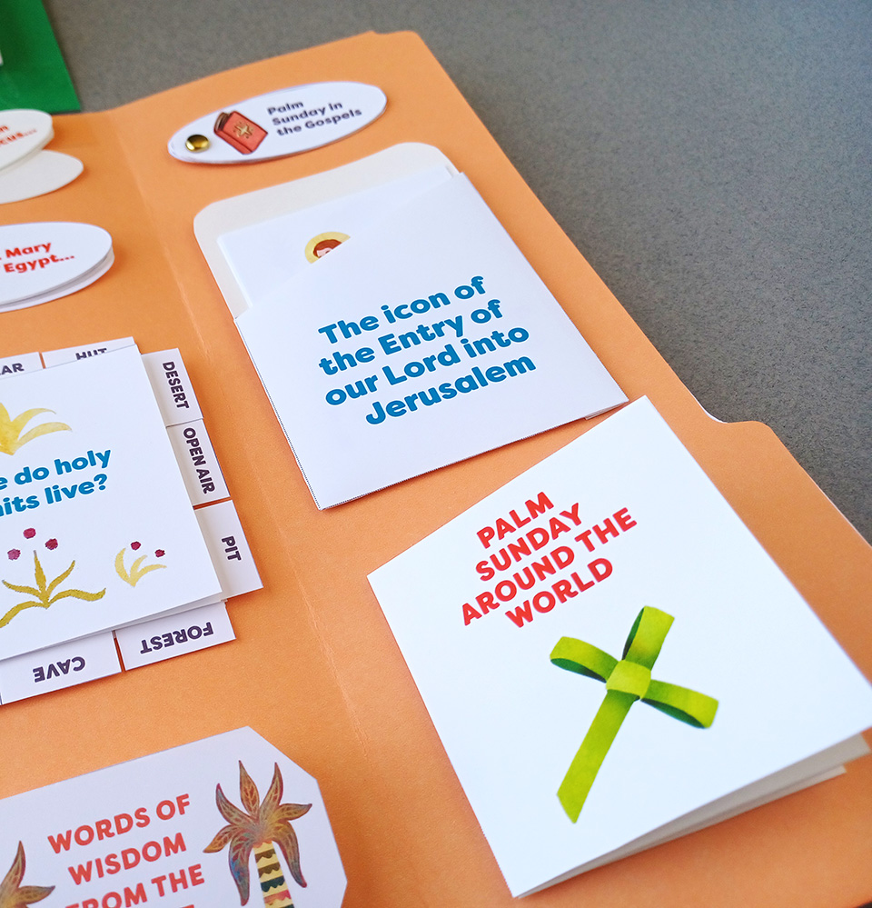 On each of the four parts of the mini book, the child writes or draws a picture of different ways in which Palm Sunday is celebrated around the world. If desired, the focus can only be on Orthodox countries – or you can choose to explore how Palm Sunday is universally celebrated by all Christians. Helpful links can be found at the Background section of our lesson plan on Palm Sunday (see buttons at the top of the page).