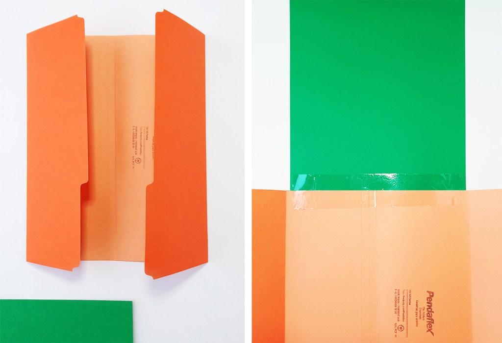 Cut the cover image all around, then, down the middle of the cover image, mark the shape of the folder opening with a pencil. Cut the image in half down the middle, following the shape of the folder front cover. Glue onto the cover.