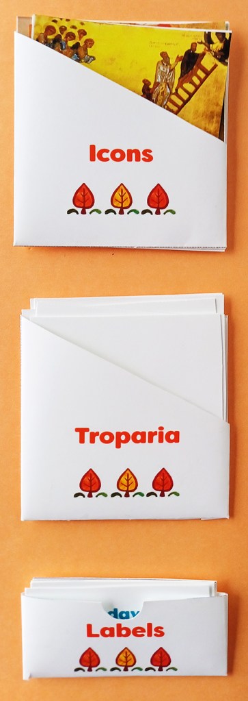 - A pocket to hold cards of the troparia, one for each Sunday.