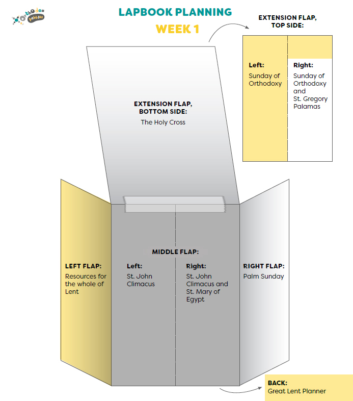 The lapbook is separated into sections, one section for each Sunday of Great Lent. The student can work on the lapbook gradually, aiming to have it completed by Palm Sunday evening.