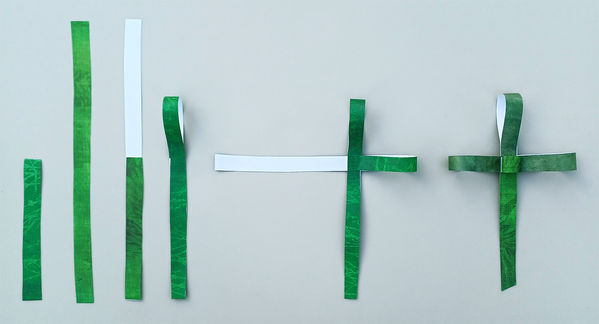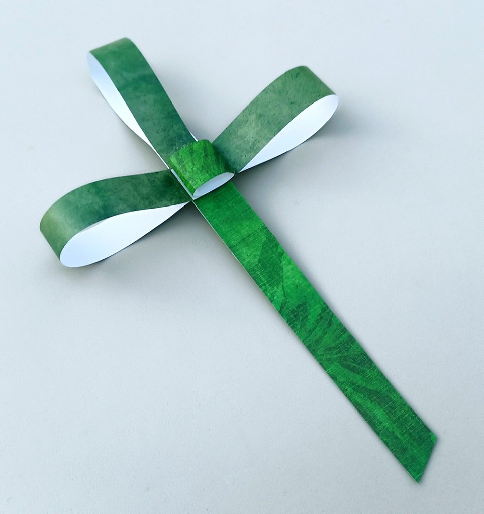 - To finish the cross, fold the two parts of the second strip to the center, gluing them in place. Cut a piece off of the remaining half-strip, about 1/3 of its total length. Form this piece into a loop and secure with a little glue. Glue the loop onto the center of the paper cross. Ready!