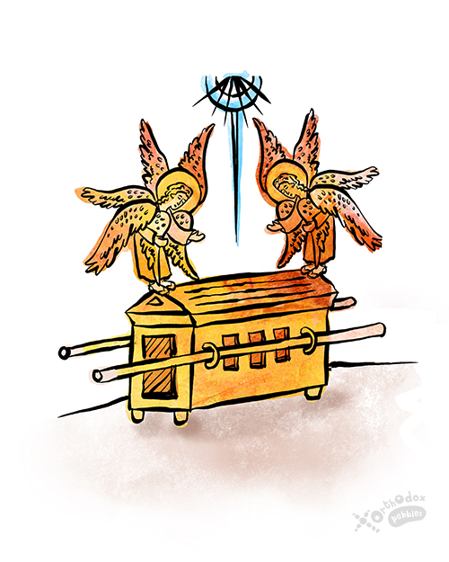 The golden Ark is a prefiguration of the Theotokos: Just as God was present in the Ark, He was also present inside the Theotokos. Additionally, all the sacred objects inside the Ark are prefigurations of the Theotokos and Christ: the manna in the Jar is Christ, while the Jar itself is the Theotokos; the Law inscribed on the tablets is Christ, while the tablets themselves are the Theotokos; the almond blossoms and fruit on Aaron’s staff are Christ, while the staff itself is the Theotokos.