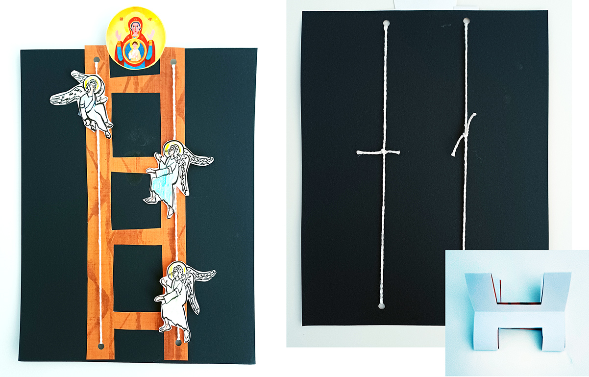 • Punch two holes on the top of the ladder and two on the bottom as shown. Thread one piece of string through a top hole and through the corresponding bottom hole, then tie it in a knot at the back. Repeat with the other string. Glue the Theotokos in front of the ladder.