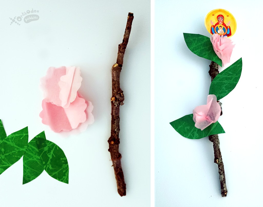 • Tape or glue the Theotokos circle onto the branch, then tape on the leaves and flowers. READY!