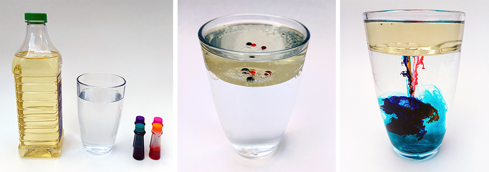 - In a few minutes, the color will pass through the layer of oil and start dissolving into the water in a dramatic way.