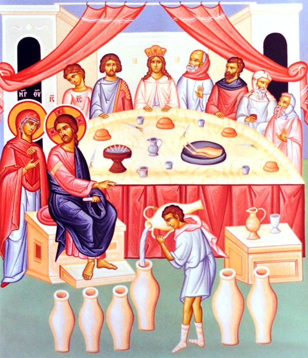 - On the icon of the Wedding in Cana, point to Jesus Christ, the Theotokos, the bride, the groom, the water turned into wine.