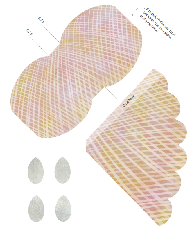 - Roll the top part into a cone and glue it together as marked. Flatten the bottom part of the cone with your fingers. This is the part that will be inserted into the pouch.