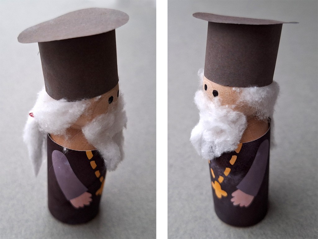 Gently pull apart a cotton ball, flattening with your fingers, until you have a flat piece of cotton. Move it all around the head pushing down with your fingers, and use scissors to cut it into the appropriate shape. In the back, you can cut it or leave it longer, to make your priest have long hair. Do the same with another piece of cotton for the beard. Glue the hair and beard in place. Place the hat on top of the hair and draw the eyes using a Sharpie. READY!