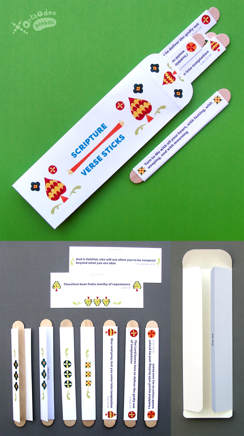 Motivated by this discussion, we created a set of Scripture verse sticks, a quick, simple, and inspirational craft. These sticks can be used as prompts for reflection and discussion, or as motivational bookmarks. They could also make a thoughtful Pascha gift.