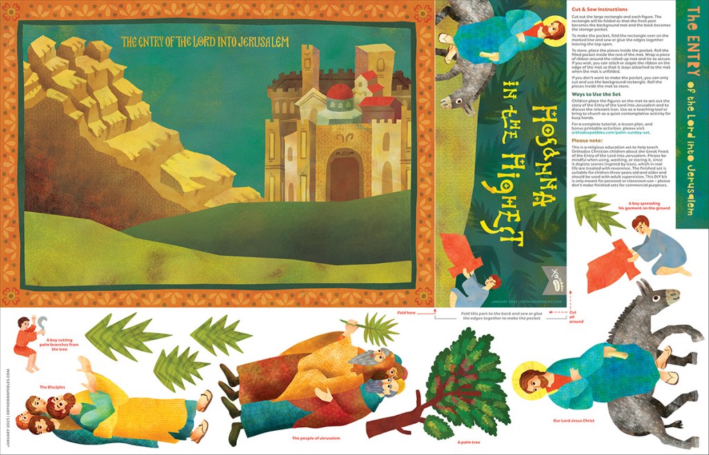 Our learning set is an act-out educational resource made out of soft fleece. It teaches the story of the Triumphant Entry of our Lord into Jerusalem in a hands-on, Orthodox-focused way, helping the children better understand and remember the commemorated events of this Great Feast. The illustrations are based on the Orthodox iconography of the Feast, incorporating all relevant theological elements.