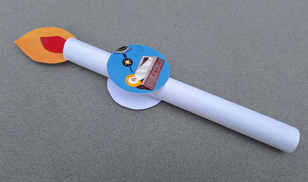 Cut out 14 paper rectangles using the template provided. Roll each rectangle into a long, narrow cylinder about 0.75 in diameter with the help of a wooden spoon. Secure the cylinder using regular tape – it is the easiest and cleanest option, and it doesn’t really show on the white paper. Cut out the flames from yellow and red paper, using the provided templates. Again, it is faster if you fold the paper and cut out many shapes at once. Glue the little red flames onto the yellow ones. Cut two tiny slits on the top of the cylinder. Add a tiny drop of glue onto each slit, then insert the flame as shown. Let the glue dry. Glue one image circle onto one side of the candle, then its corresponding white circle on the opposite side.