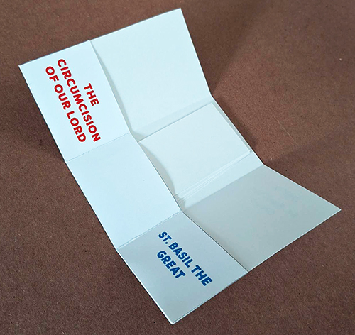 This activity helps discuss both of the feasts commemorated on this day. The child writes (or draws a picture of) a detail about each feast on every card. The cards are then shuffled and placed in the center pocket. The child takes out the cards from the center pocket and has to sort them, deciding whether each card belongs to the left pocket (Circumcision) or to the right one (St. Basil).