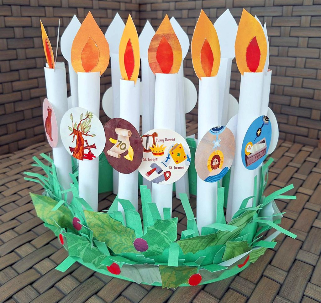 Again, there are many ways one could make a craft with these circles. After gluing the images and their corresponding white circles back-to-back, they could be turned into some kind of timeline garland, horizontally or vertically. Or they could be turned into Christmas tree ornaments by being glued on larger circles cut out of colored paper. Another option would be to make the paper candle wreath we are showing below.